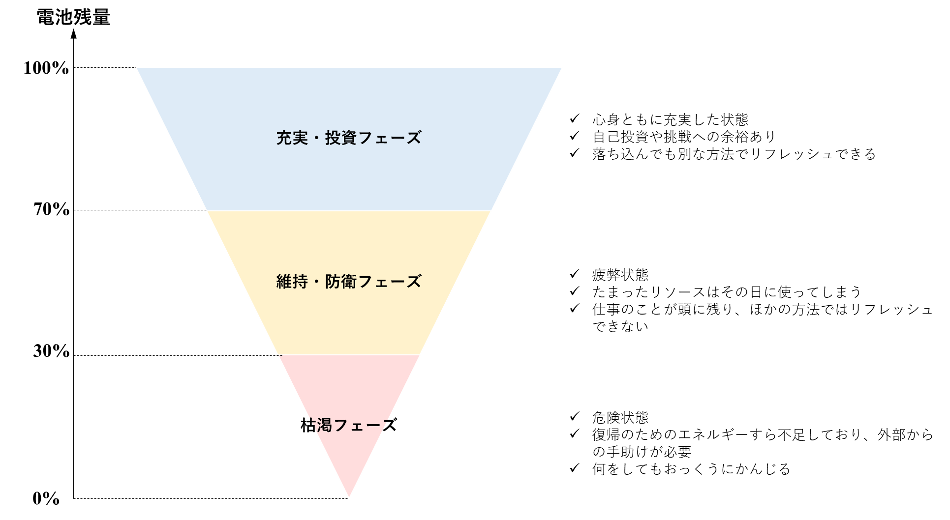 そんなこんなで自分を追い込むようになると、スマホのバッテリーと同じでエネルギーが切れてきて、自分の状態が変化してきます。自分が考えるイメージを図にしてみました。