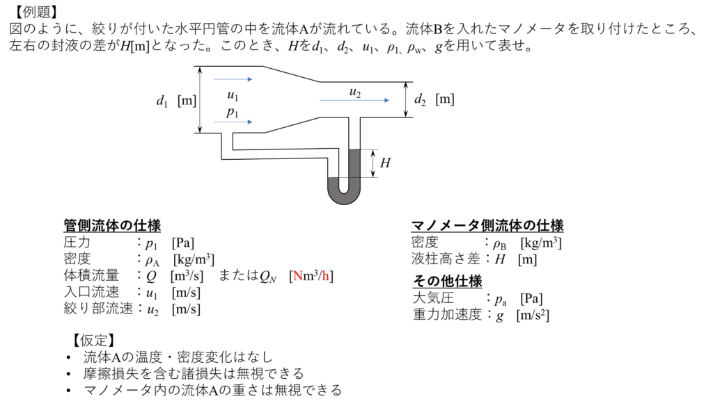 なお、今回はHを他の諸量で表現しましたが、問題文中でHが与えられていれば、流速を求めることができます。流速がわかれば、体積流量や質量流量を求めることも可能です。