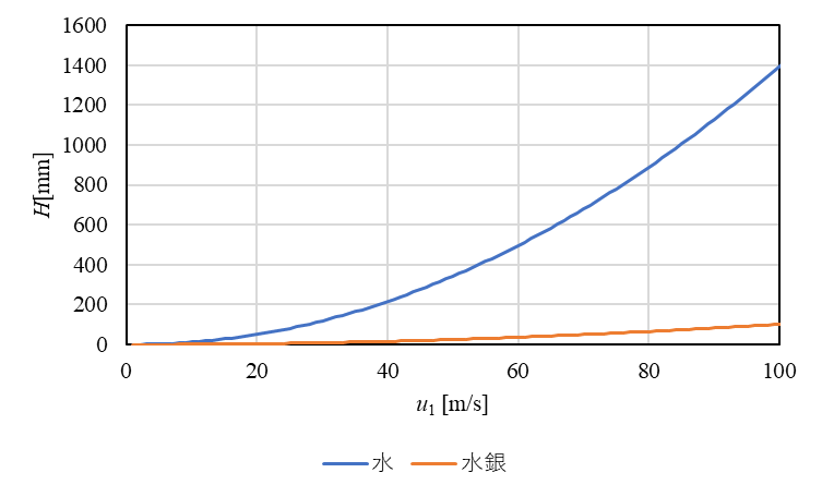 マノメータ内の流体を水(密度1000kg/m3)、水銀(密度13600kg/m3)で比較すると下記のとおりです。