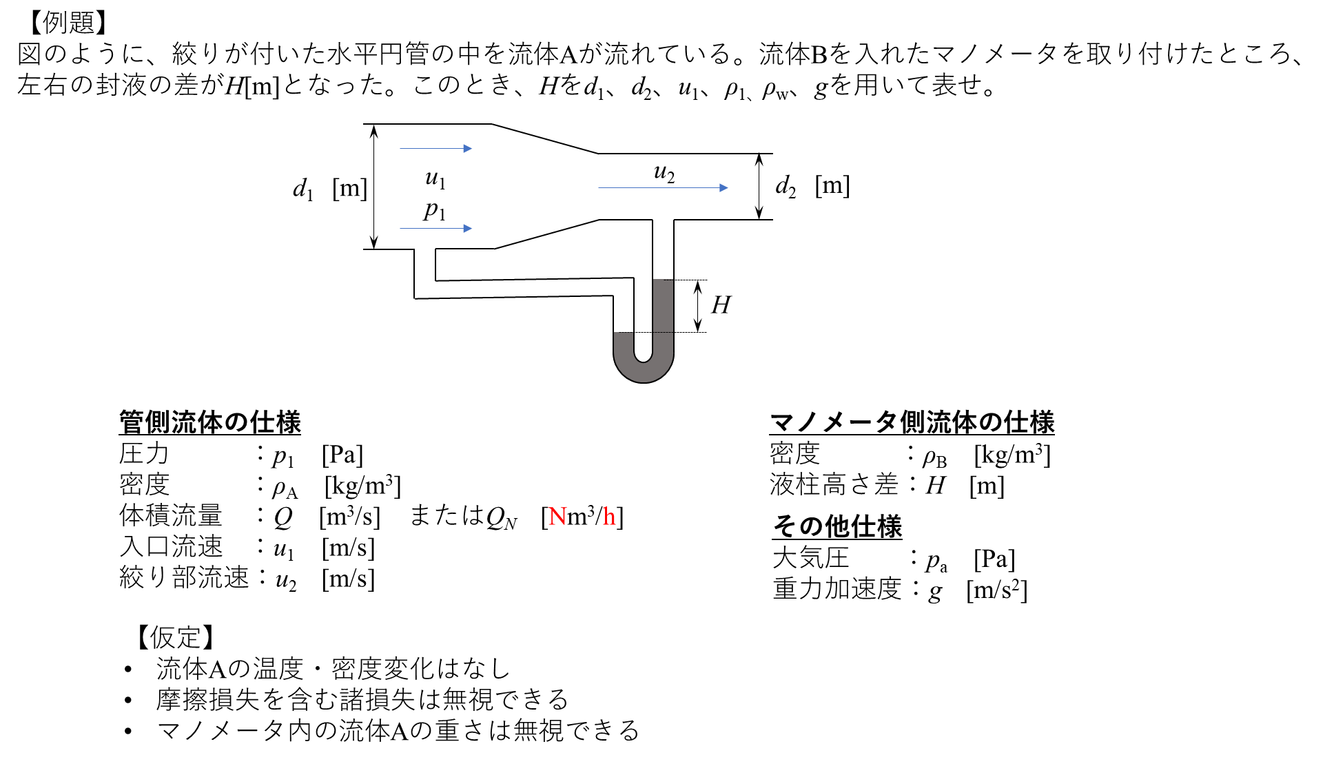 なお、今回はHを他の諸量で表現しましたが、問題文中でHが与えられていれば、流速を求めることができます。流速がわかれば、体積流量や質量流量を求めることも可能です。